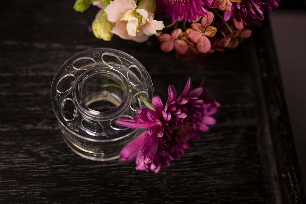 Each vase holds water in the base and features a removable top with thoughtfully placed holes for flower stems. Using them is easy. Fill the base with water, secure the top with a few small pieces of clear tape, place the ring on a candlestick, then insert a taper candle through the center. Arrange your blooms and enjoy a striking centerpiece with no floral foam required. No candlestick? No problem. These rings also create a beautiful base for a standalone taper candle.